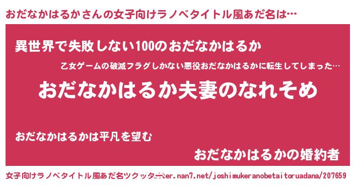 | 男性向けラノベタイトル風あだ名 | 『おまえをオタクにしてやるから、俺をおだなかはるかにしてくれ! 』 |