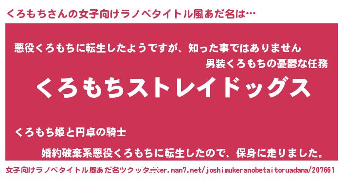 | 男性向けラノベタイトル風あだ名 | 『Re:くろもちから始める異世界生活』 |