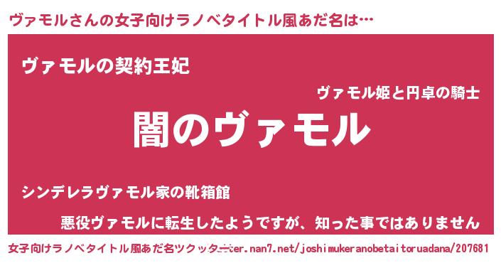 | 男性向けラノベタイトル風あだ名 | 『Re:ヴァモルから始める異世界生活』 |