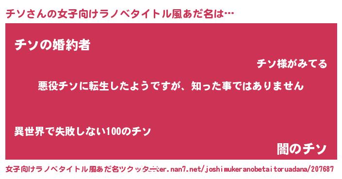 | 男性向けラノベタイトル風あだ名 | 『この素晴らしい世界にチソを!』 |