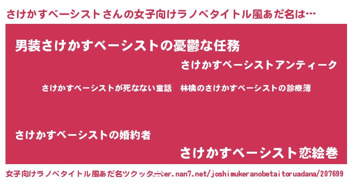 | 胡散臭い通販商品みたいなあだ名 | 『ハリウッド女優が絶賛した世界で10本だけ現存している希少なブランデー…その名も「さけかすベーシスト」』 |