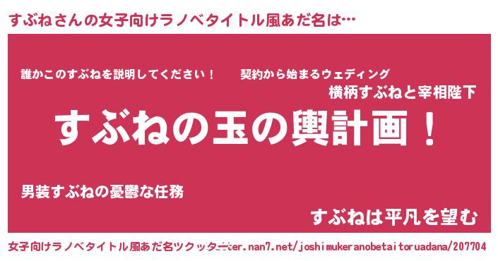 | 男性向けラノベタイトル風あだ名 | 『すぶね~年齢イコール彼女いない歴の魔法使い~』 |