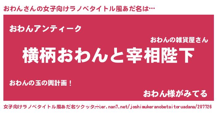 | 男性向けラノベタイトル風あだ名 | 『おわんに滅ぼされるだけの簡単なお仕事です』 |
