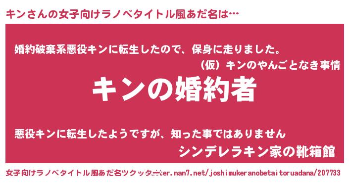 | 男性向けラノベタイトル風あだ名 | 『うちの娘の為ならば、俺はもしかしたらキンも倒せるかもしれない。』 |