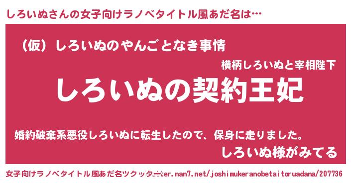 | 男性向けラノベタイトル風あだ名 | 『しろいぬという概念が存在しない退屈な世界 』 |