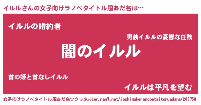 | 男性向けラノベタイトル風あだ名 | 『Re:イルルから始める異世界生活』 |