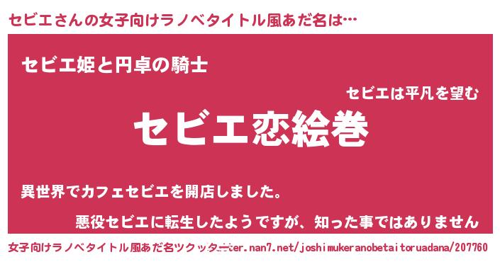 | 男性向けラノベタイトル風あだ名 | 『おまえをオタクにしてやるから、俺をセビエにしてくれ! 』 |