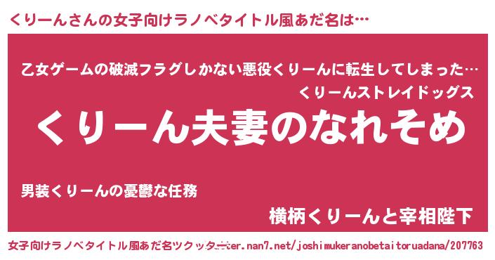 | 男性向けラノベタイトル風あだ名 | 『おまえをオタクにしてやるから、俺をくりーんにしてくれ! 』 |