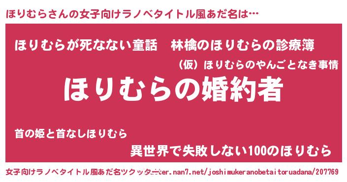 | 男性向けラノベタイトル風あだ名 | 『うちの娘の為ならば、俺はもしかしたらほりむらも倒せるかもしれない。』 |