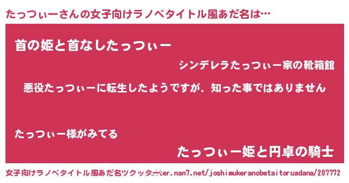 | 男性向けラノベタイトル風あだ名 | 『この素晴らしい世界にたっつぃーを!』 |