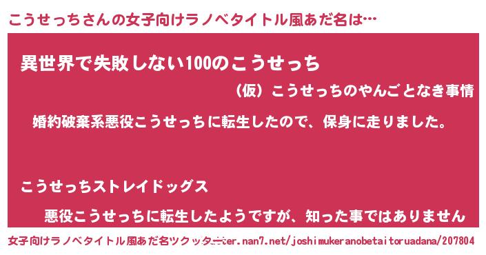 | 男性向けラノベタイトル風あだ名 | 『コウセッチスレイヤー』 |