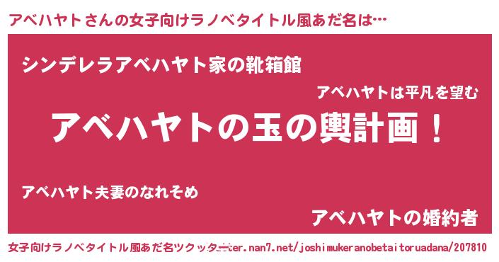 | 男性向けラノベタイトル風あだ名 | 『アベハヤト~年齢イコール彼女いない歴の魔法使い~』 |