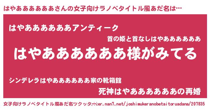 | 男性向けラノベタイトル風あだ名 | 『はやああああああの嫁は女の子じゃないと思った?』 |