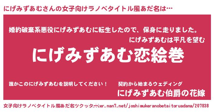 | 男性向けラノベタイトル風あだ名 | 『おまえをオタクにしてやるから、俺をにげみずあむにしてくれ! 』 |