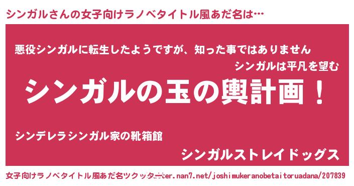| 男性向けラノベタイトル風あだ名 | 『シンガル~年齢イコール彼女いない歴の魔法使い~』 |