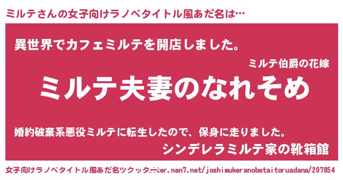 ミルテさんの女子向けラノベタイトル風あだ名は… 『ミルテ夫妻のなれそめ』『異世界でカフェミルテを開店しました。』『シンデレラミルテ家の靴箱館』 ツクッター #女子向けラノベタイトル風あだ名ツクッター http://tkutter.nan7.net/joshimukeranobetaitoruadana/207854/