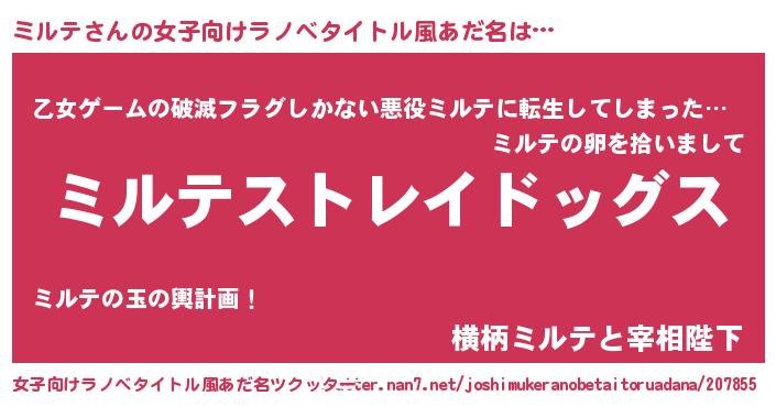 | 男性向けラノベタイトル風あだ名 | 『Re:ミルテから始める異世界生活』 |