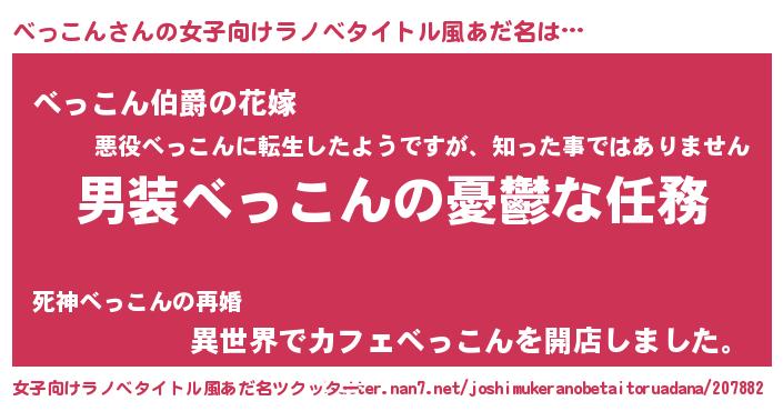 | 男性向けラノベタイトル風あだ名 | 『うちのべっこんが世界を掌握している!』 |