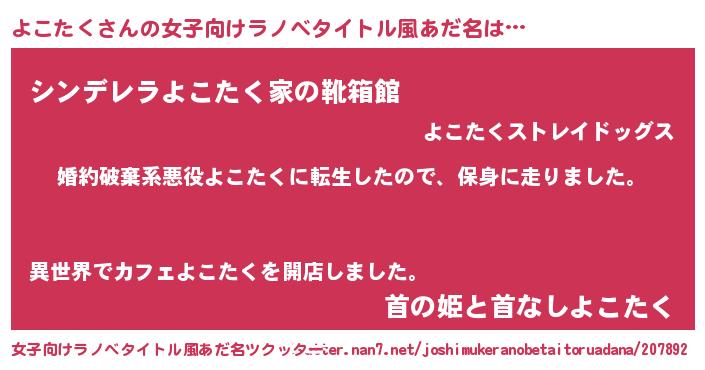 | 男性向けラノベタイトル風あだ名 | 『ヨコタクスレイヤー』『緋弾のヨコタク』 |