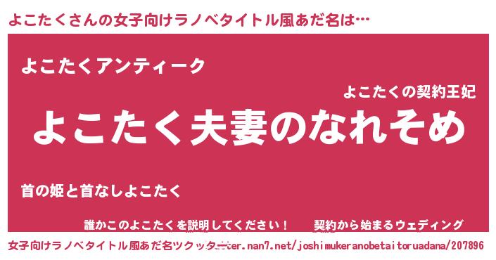 | 男性向けラノベタイトル風あだ名 | 『おまえをオタクにしてやるから、俺をよこたくにしてくれ! 』 |