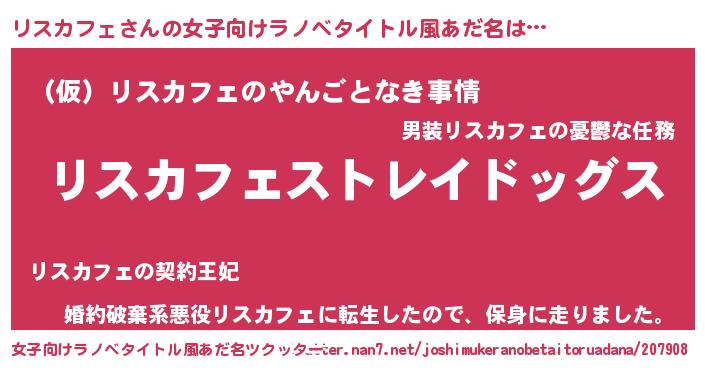 | 男性向けラノベタイトル風あだ名 | 『Re:リスカフェから始める異世界生活』 |