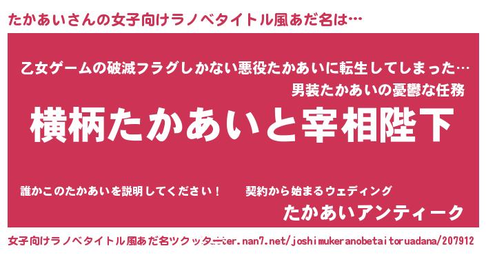 | 胡散臭い通販商品みたいなあだ名 | 『あなたにだけ特別に提供する世界で10本だけ現存している希少なブランデー…その名も「たかあい」』 |