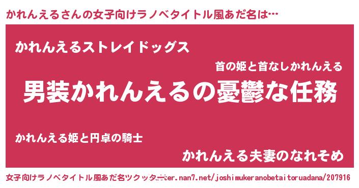 かれんえるさんの女子向けラノベタイトル風あだ名は… 『男装かれんえるの憂鬱な任務』『かれんえるストレイドッグス』『かれんえる夫妻のなれそめ』 ツクッター #女子向けラノベタイトル風あだ名ツクッター http://tkutter.nan7.net/joshimukeranobetaitoruadana/207916/