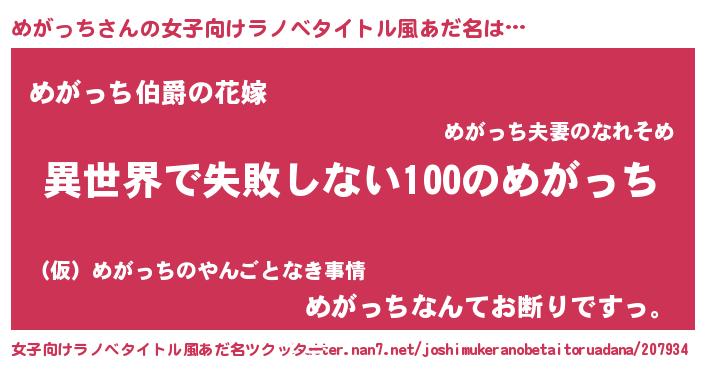 | 男性向けラノベタイトル風あだ名 | 『めがっちという概念が存在しない退屈な世界 』 |