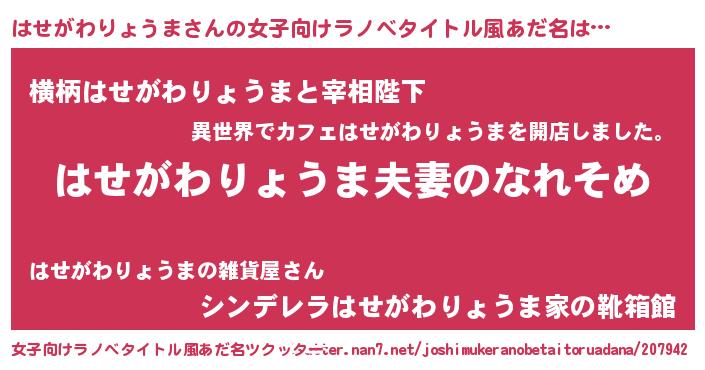 | 男性向けラノベタイトル風あだ名 | 『おまえをオタクにしてやるから、俺をはせがわりょうまにしてくれ! 』 |