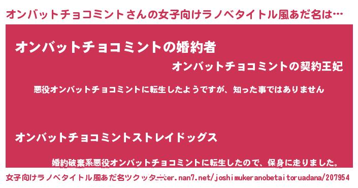| 男性向けラノベタイトル風あだ名 | 『この素晴らしい世界にオンバットチョコミントを!』 |
