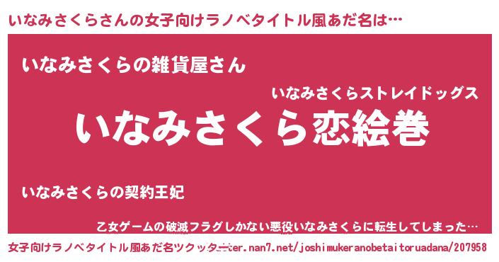 | 男性向けラノベタイトル風あだ名 | 『おまえをオタクにしてやるから、俺をいなみさくらにしてくれ! 』 |