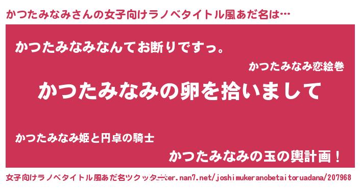 かつたみなみさんの女子向けラノベタイトル風あだ名は… 『かつたみなみの卵を拾いまして』『かつたみなみなんてお断りですっ。』『かつたみなみの玉の輿計画!』 ツクッター #女子向けラノベタイトル風あだ名ツクッター http://tkutter.nan7.net/joshimukeranobetaitoruadana/207968/
