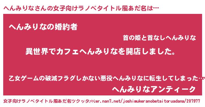 | 男性向けラノベタイトル風あだ名 | 『誰もが恐れるあのへんみりなが、ぼくの専属メイドになるようです。』 |
