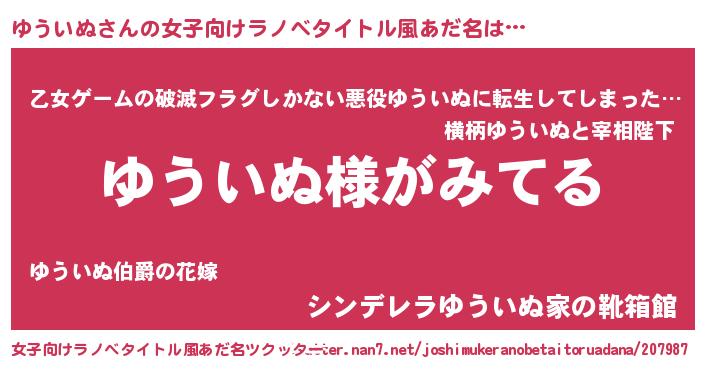 ゆういぬさんの女子向けラノベタイトル風あだ名は… 『ゆういぬ様がみてる』『乙女ゲームの破滅フラグしかない悪役ゆういぬに転生してしまった…』『シンデレラゆういぬ家の靴箱館』 ツクッター #女子向けラノベタイトル風あだ名ツクッター http://tkutter.nan7.net/joshimukeranobetaitoruadana/207987/