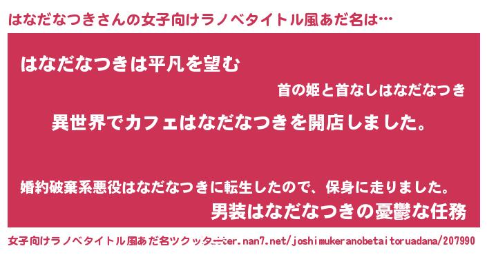 | 男性向けラノベタイトル風あだ名 | 『誰もが恐れるあのはなだなつきが、ぼくの専属メイドになるようです。』 |
