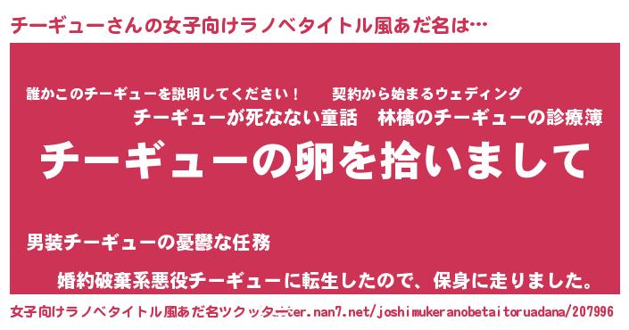 | 男性向けラノベタイトル風あだ名 | 『チーギューの嫁は女の子じゃないと思った?』 |