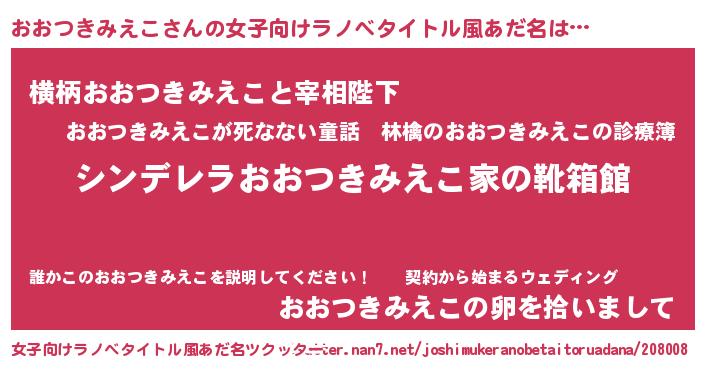 | 胡散臭い通販商品みたいなあだ名 | 『信頼と実績のサプリメント…その名も「おおつきみえこ」』 |