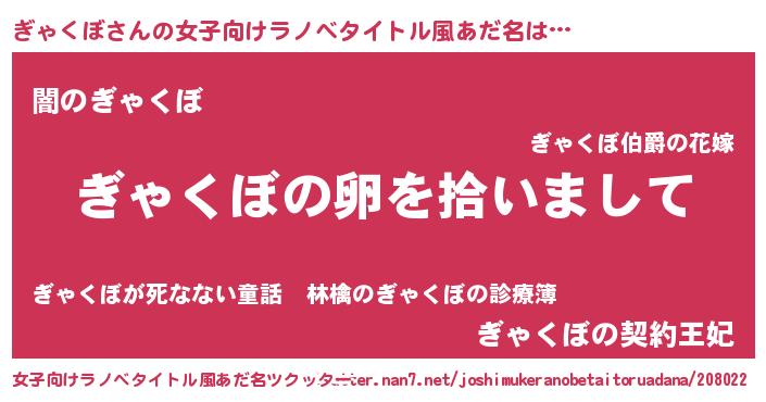 | 男性向けラノベタイトル風あだ名 | 『ダンジョンにぎゃくぼを求めるのは間違っているだろうか』 |