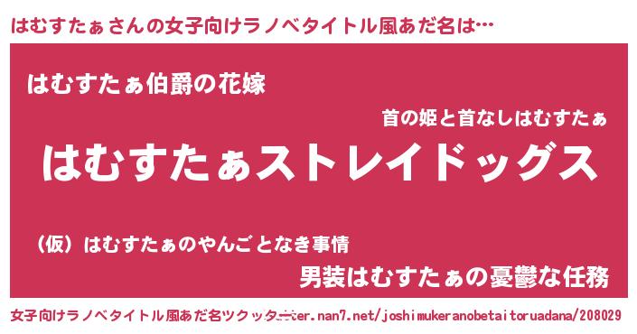 | 男性向けラノベタイトル風あだ名 | 『Re:はむすたぁから始める異世界生活』 |