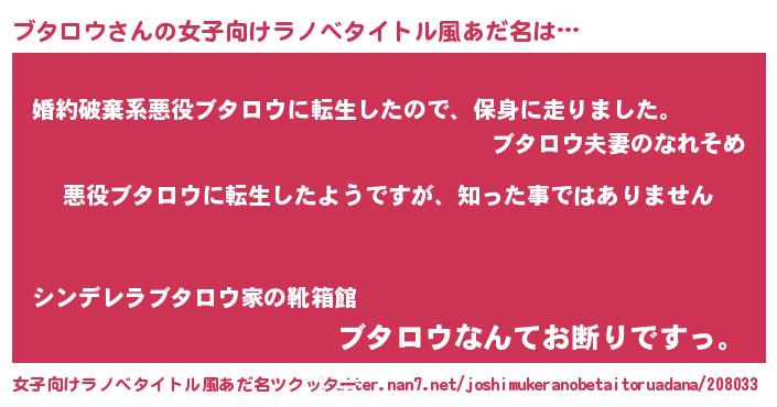 | 男性向けラノベタイトル風あだ名 | 『この素晴らしい世界にブタロウを!』 |