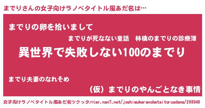 | 男性向けラノベタイトル風あだ名 | 『までりという概念が存在しない退屈な世界 』 |