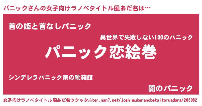 | 男性向けラノベタイトル風あだ名 | 『おまえをオタクにしてやるから、俺をパニックにしてくれ! 』 |