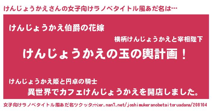 | 男性向けラノベタイトル風あだ名 | 『けんじょうかえ~年齢イコール彼女いない歴の魔法使い~』 |