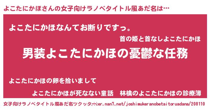 | 男性向けラノベタイトル風あだ名 | 『うちのよこたにかほが世界を掌握している!』 |