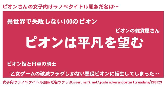 | 男性向けラノベタイトル風あだ名 | 『ダンジョンにピオンを求めるのは間違っているだろうか』 |