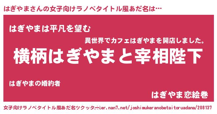 | 男性向けラノベタイトル風あだ名 | 『はぎやまに滅ぼされるだけの簡単なお仕事です』 |