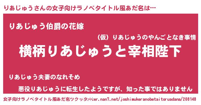 | 男性向けラノベタイトル風あだ名 | 『りあじゅうに滅ぼされるだけの簡単なお仕事です』 |