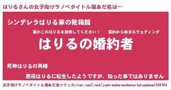 | 男性向けラノベタイトル風あだ名 | 『うちの娘の為ならば、俺はもしかしたらはりるも倒せるかもしれない。』 |