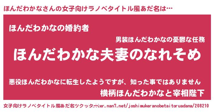 | 男性向けラノベタイトル風あだ名 | 『おまえをオタクにしてやるから、俺をほんだわかなにしてくれ! 』 |