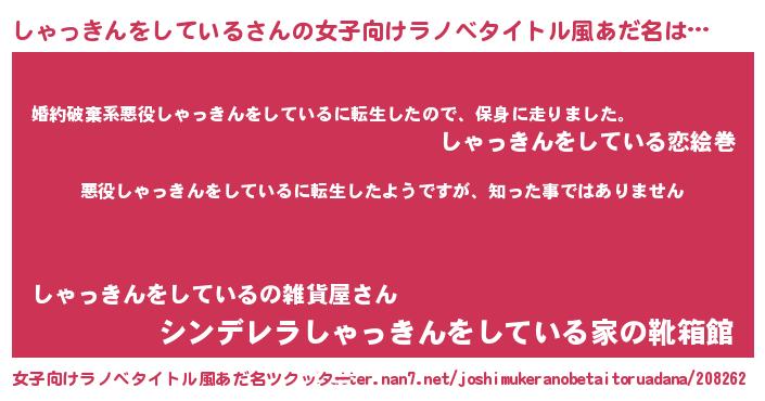 | 男性向けラノベタイトル風あだ名 | 『この素晴らしい世界にしゃっきんをしているを!』 |